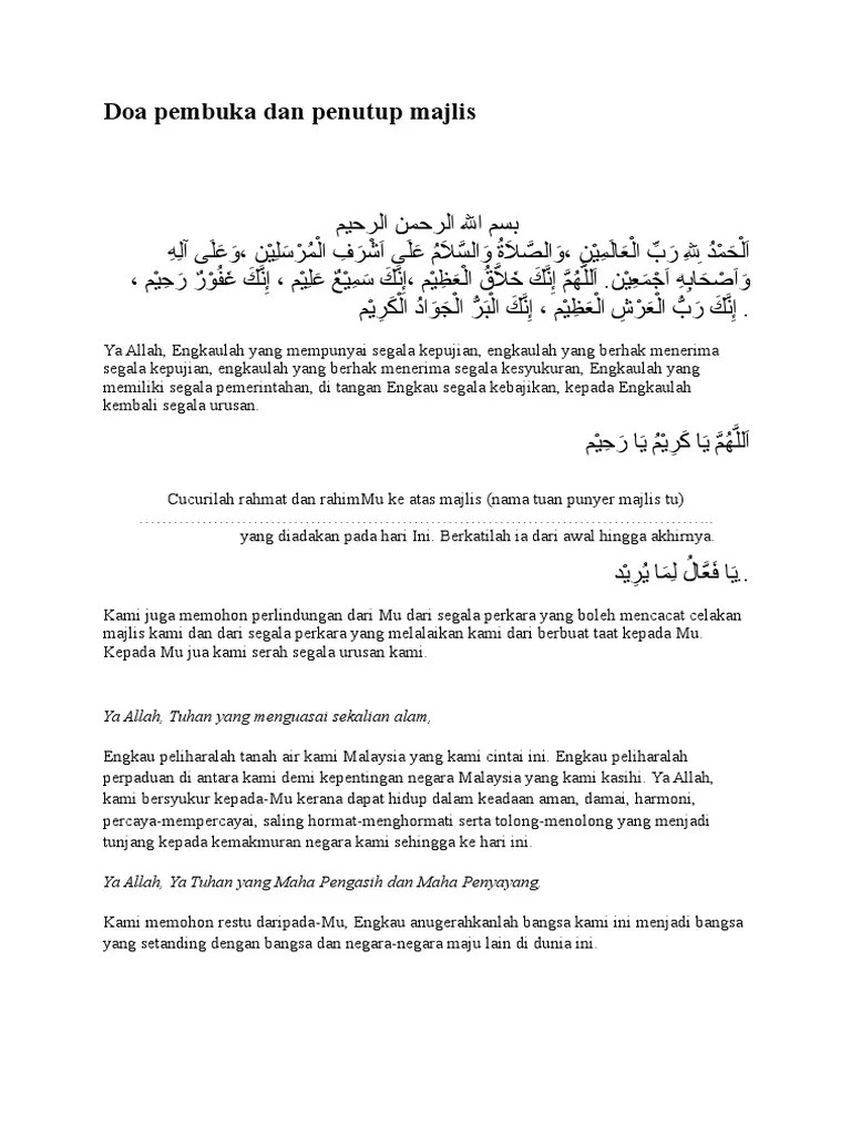 ِ علَى ا َ ْش َر ف َ سالَ ُم َّ صالَة ُ َوال َّ وال، َ ب ْالعَالَ ِميْن ِ ِ ا َ ْل َح ْم . Kami berlindung kepada allah dari. Doa pembuka majlis artinya : Majlis kesyukuran ringkas beserta maksud dalam rumi boleh print pdf. Di negara yang penduduk majoritinya adalah beragama islam seperti malaysia, seringkali pembukaan majlis rasmi atau tidak rasmi .